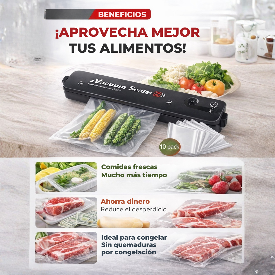 Con nuestra selladora al vacío eliminas el aire de las bolsas, prolongando la frescura y manteniendo tus alimentos protegidos por más tiempo.